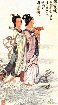 四千多年前,尧见舜德才兼备,为人正直,办事公道,吃苦耐劳,深得人心,便将其首领的位置禅让给舜,并把两个女儿娥皇、女英嫁给舜为妻。后来舜帝巡视南方,一直不回。娥皇、女英便到南方寻找,到洞庭湖时,闻舜帝死于苍梧之野。江南盛产毛竹,密密麻麻,铺天盖地。娥皇、女英在竹林里趔趔趄趄地奔跑着、濠泣着,那哭泣声感天动地,连林中小鸟也为之动情。她们的泪哭干了,白色变成红色,血都哭出来了。这如血的泪滴洒在竹干叶上,入木三分,让草木动情,竟经久不失,无论风吹雨打留下数千年的斑斑痕迹。因此,至今,泪迹可辨,后人便将此竹称为湘妃竹。