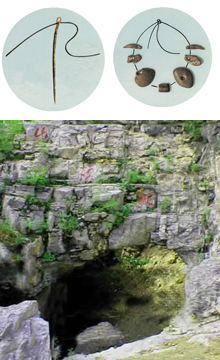 山顶洞遗址位于北京市周口店龙骨山北京人遗址顶部,山顶洞分为洞口、上室、下室和下窨(xūn)4部分。洞口向北,高约4米,下宽约5米。上室在洞穴的东半部,南北宽约8米,东西长约14米。在地面的中间发现一堆灰烬,底部的石钟乳层面和洞壁的一部分被烧炙,说明上室是山顶洞人居住的地方。在上室文化层中发现有婴儿头骨碎片、骨针、装饰品和少量石器。下室在洞穴的西半部稍低处,深约8米。发现有3具完整的人头骨和一些躯干骨,人骨周围散布有赤铁矿的粉末及一些随葬品,说明下室是葬地。下窨在下室深处,是一条南北长3米、东西宽约1米的裂隙。发现了许多完整的动物骨架,推测它们是在人类入居以前,偶然坠入这个天然“陷阱”之中的。