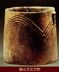 磁山遗址的陶器以夹砂红陶为主,火候较低,质地粗糙,器表多素面。陶器多采用泥条盘筑法,器形不规整。陶器表面纹饰有绳纹、编织纹、篦纹、乳钉纹等。器形有椭圆形陶壶、靴形支架、盂、钵等。