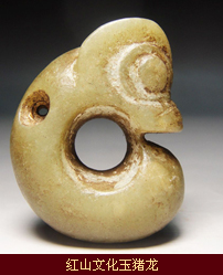 中国是龙的国度,中华民族是龙的传人。龙,是中国古代人们心目中的神。因此,红山文化玉龙的发现立即引起了学术界的关注。红山文化玉龙已在多处发现,其中尤以内蒙古三星他拉出土的玉龙刻划的最为栩栩如生。这条玉龙墨绿色,高26厘米,完整无缺,体蜷曲,呈C字形。吻部前伸,略向上弯曲,嘴紧闭,有对称的双鼻孔,双眼突起呈棱形。龙背有对称的单孔,经试验此孔用于悬挂,龙的头尾恰好处于同一水平线上。