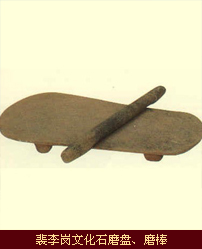 有专家说它是原始社会晚期的遗物,为碾谷物的生产工具,但是没有说明具体时代。石磨盘的形状像一块长石板,而两头呈圆弧形,像鞋底状。石磨盘是用整块的砂岩石磨制而成的,正面稍凹,可能是长期使用造成的。大多石磨盘的底部有四个圆柱状的磨盘腿,高3至6厘米。石磨盘一般长70厘米左右,最长者可达1米,宽度一般为20厘米至30厘米。与其配套使用的是石磨棒,它的长度一般约30厘米至40厘米,直径6厘米左右。真是难以想象,7000年之前,在如此遥远的时代,人类就能够用整块的石板琢磨出可供谷物脱壳的加工工具,而更加令人难以理解的是,这种凝聚着原始人类高度智慧的生产工具,为什么在它以后的文化层中突然神秘地消失了呢?这究竟是出于什么原因呢?