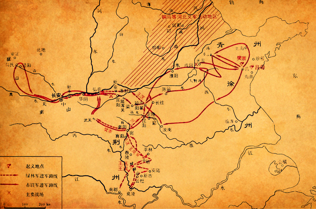 绿林兴起的第二年,山东、苏北一带也爆发了武装起义。当时,青、徐大饥,饥民们无以为生,往往自发组织起来,抢掠度日。山东莒县难民为统一行动,推举琅邪人樊崇为首领,尊之曰“三老”。樊崇率众以泰山为根据地,辗转作战。不到一年就聚众万余人。这时,同郡逢安和东海徐宣、谢禄、杨音等人也率众万余人加入樊崇的队伍。他们进攻莒县,转掠姑幕,打败了田况所率的四万征剿大军,消灭敌人万余。