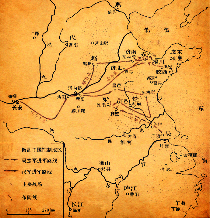 景帝派太尉周亚夫率三十六将军往击吴楚,派郦寄击赵,栾布击齐地诸叛国,并以大将军窦婴驻屯荥阳,监齐、赵兵。在吴楚军西向攻取洛阳的道路中,景帝弟刘武的封国梁国横亘其间。吴楚军破梁军于梁国南面的棘壁(今河南永城西北)。当时周亚夫率汉军屯于梁国以北的昌邑(今山东巨野东南),他不救梁国之急,而以轻兵南下,夺取泗水入淮之口(在今江苏洪泽境),截断吴楚军的粮道,使其陷入困境。