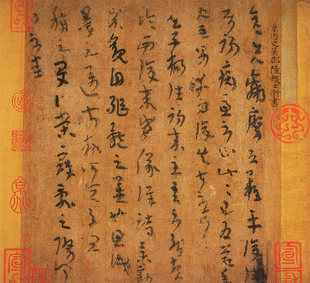陆机的书法,在书坛有一定地位,王僧虔、庾肩吾等都曾有记述。《平复帖》是其写给友人的一个信札,其中有病体“恐难平复”字样,因此得名。字为章草,但无挑波,和《淳化阁》所收卫瓘的《顿首州民贴》体段相近,大约是当时流行的一种实用书体。此帖之字奇幻难读,当不是偶然现象。此书笔法质朴老健,笔画盘丝屈铁,结体茂密自然,富有天趣。在现在见到的同时期及其以前的墨迹中是很突出的。《平复帖》距今已有1700余年,是现存年代最早并真实可信的西晋名家法帖。它用秃笔写于麻纸之上,笔意婉转,风格平淡质朴,其字体为草隶书。
