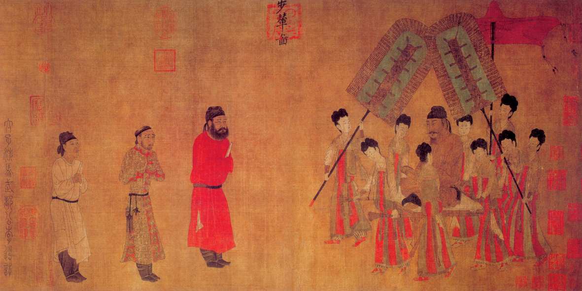 图卷右半是在宫女簇拥下坐在步辇中的唐太宗,左侧三人前为典礼官,中为禄东赞,后为通译者。唐太宗的形象是全图焦点。作者煞费苦心地加以生动细致的刻画,画中的唐太宗端坐于步辇之上,面目俊朗,目光深邃,神情庄重,充分展露出盛唐一代明君的风范与威仪。为了更好地突现出太宗的至尊风度,作者巧妙地运用对比手法进行衬托表现。一是以宫女们的娇小、稚嫩,以她们或执扇或抬辇、或侧或正、或趋或行的体态来映衬唐太宗的壮硕、深沉与凝定,是为反衬;二是以禄东赞的诚挚谦恭、持重有礼来衬托唐太宗的端肃平和、蔼然可亲之态,是为正衬。该图不设背景,结构上自右向左,由紧密而渐趋疏朗,重点突出,节奏鲜明。