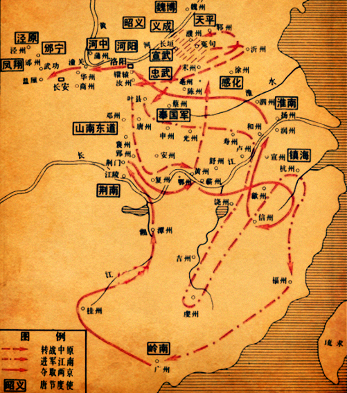 因为唐朝政府加强了对东都洛阳的防守,所以起义军在中原未能打开局面,开始转战江南,进入浙东。起义军一路上势如破竹,接连打下越州、衢州(今浙江衢县);接着,又劈山开路,打通了从衢州到建州(今福建建瓯)的七百里山路。经过一年多的长征,一直打到广州。此时起义队伍已经有百万之众。随后,黄巢转战桂林,率军北伐,并且发布檄文,正式向腐朽的唐朝政府宣战。