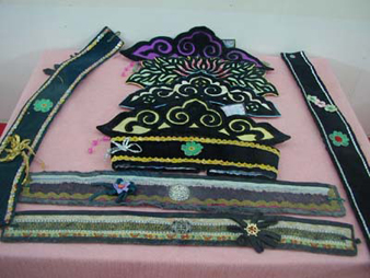 清代用于女式袍褂的领口、补贴口和襟摆上,饰以花纹镶边。男式皮袍的襟摆边和衩口边上,皮制套裤的膝部靰鞡帮沿以及烟口袋上部,都要饰以各种图案。在染成米黄色的鹿罕狍皮手套上,装饰图案全是用黑色薄皮贴缝而成。