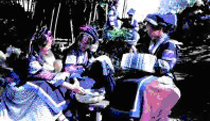 4、贵阳市郊、黔南州西部、黔西南州和安顺地区一些县,妇女上身多穿大襟衣,下着长裤,多数地区衣裤边缘镶栏干,但各地有所不同。普安、晴隆一带衣长过膝,包青布头帕,一端垂盖后颈。贵阳市郊及附近几县上衣长至膝盖,多无小领,姑娘以发辫挽头数圈,有的包头帕,有的不包,普遍挂围腰,绣有各种精致图案。婚后包头帕为蓝布头巾。